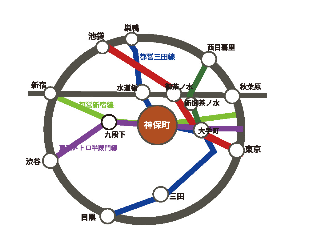神田神保町界隈(1丁目~3丁目)へは、以下の最寄り駅が便利です。